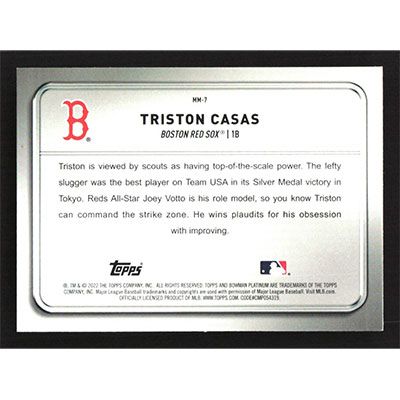 This is a 2022 Bowman Platinum Minted in Merit Triston Casas baseball card. The card is #MM-7 and pictures show condition.