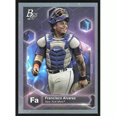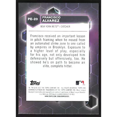 This is a 2022 Bowman Platinum Precious Elements Francisco Alvarez baseball card. The card is #PE-20 and pictures show condition.