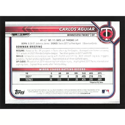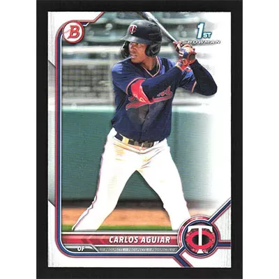 This is a 2022 Bowman Prospects Carlos Aguiar baseball card. The card is #BP-1 and pictures show condition.