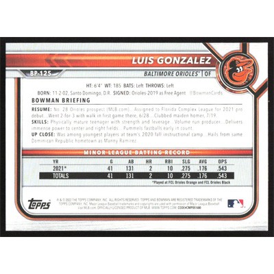 This is a 2022 Bowman Prospects Luis Gonzalez baseball card. The card is #BP-125 and pictures show condition.