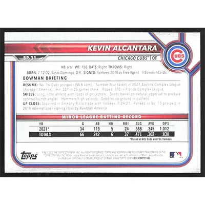 This is a 2022 Bowman Prospects Kevin Alcantara baseball card. The card is #BP-31 and pictures show condition.