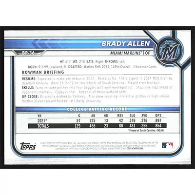This is a 2022 Bowman Prospects Brady Allen baseball card. The card is #BP-36 and pictures show condition.