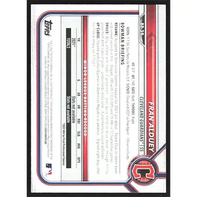 This is a 2022 Bowman Prospects Fran Alduey baseball card. The card is #BP-39 and pictures show condition.