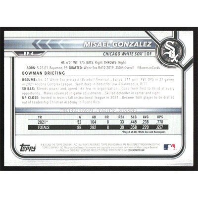 This is a 2022 Bowman Prospects Misael Gonzalez baseball card. The card is #BP-4 and pictures show condition.