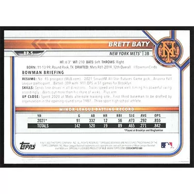 This is a 2022 Bowman Prospects Brett Baty baseball card. The card is #BP-5 and pictures show condition.