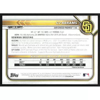 This is a 2022 Bowman Prospects CJ Abrams baseball card. The card is #BP-9 and pictures show condition.