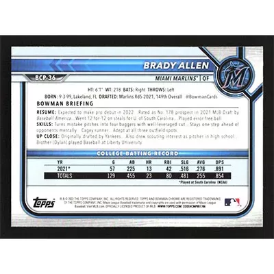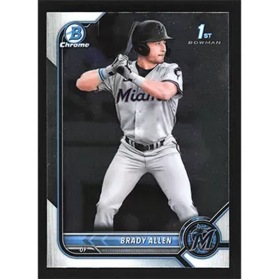 This is a 2022 Bowman Sapphire Edition Brady Allen baseball card. The card is #BCP-36 and pictures show condition.