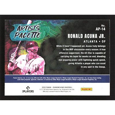 This is a 2022 Diamond Kings Artist's Palette Ronald Acuña Jr. baseball card. The card is #AP-14 and pictures show condition.
