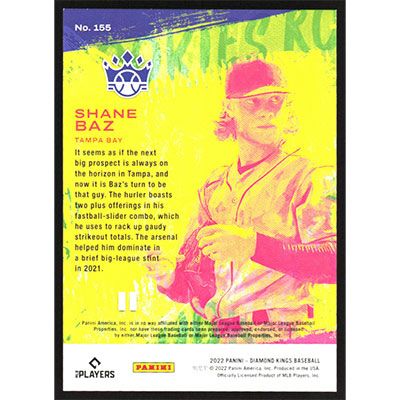This is a 2022 Diamond Kings Red Frame Shane Baz baseball card. The card is #155 and pictures show condition. Team(s): Tampa Bay Rays Rookie Card (RC)