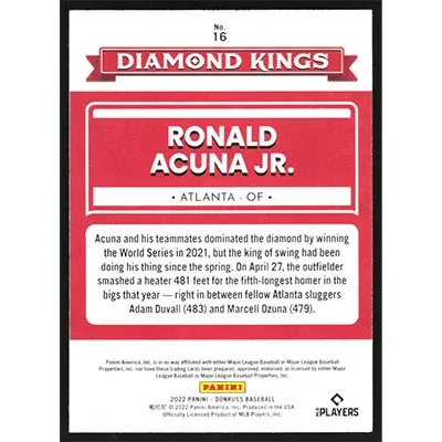 This is a 2022 Donruss Ronald Acuña Jr. Diamond Kings baseball card. The card is #16 and pictures show condition.