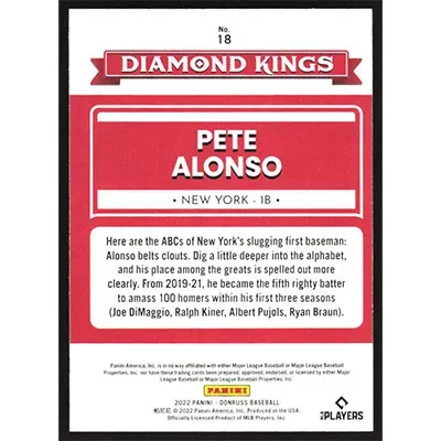 This is a 2022 Donruss Pete Alonso Diamond Kings baseball card. The card is #18 and pictures show condition.