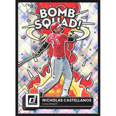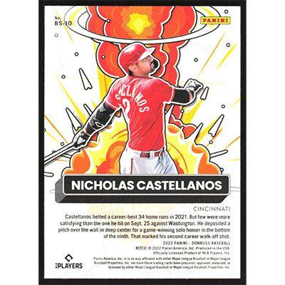 This is a 2022 Donruss Bomb Squad Diamond Nicholas Castellanos baseball card. The card is #BS-10 and pictures show condition.