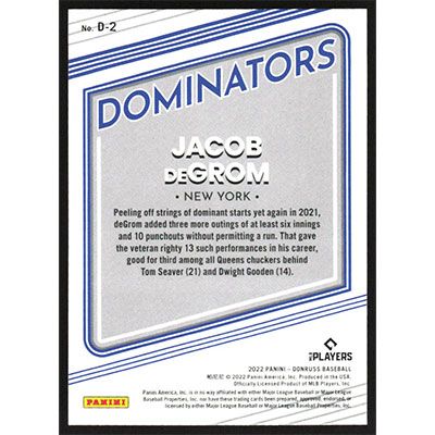 This is a 2022 Donruss Dominators Pink Fireworks Jacob deGrom baseball card. The card is #D-2 and pictures show condition.