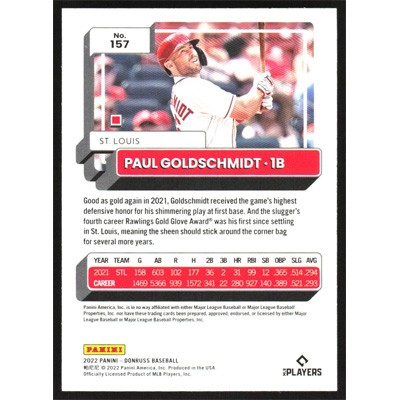 This is a 2022 Donruss Holo Blue Paul Goldschmidt baseball card. The card is #157 and pictures show condition.