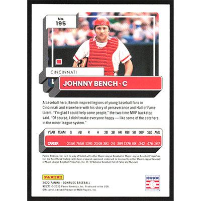 This is a 2022 Donruss Holo Blue Johnny Bench baseball card. The card is #195 and pictures show condition.