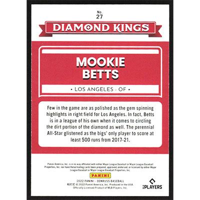 This is a 2022 Donruss Holo Orange Mookie Betts Diamond Kings baseball card. The card is #27 and pictures show condition.