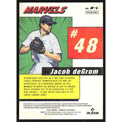 This is a 2022 Donruss Marvels Pink Fireworks Jacob deGrom baseball card. The card is #M-6 and pictures show condition.