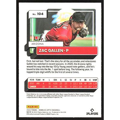 This is a 2022 Donruss Optic Zac Gallen baseball card. The card is #104 and pictures show condition.
