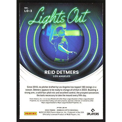 This is a 2022 Donruss Optic Lights Out Holo Reid Detmers baseball card. The card is #LO-3 and pictures show condition. Team(s): Los Angeles Angels Rookie Card (RC)