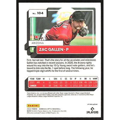 This is a 2022 Donruss Optic Pink Zac Gallen baseball card. The card is #104 and pictures show condition.