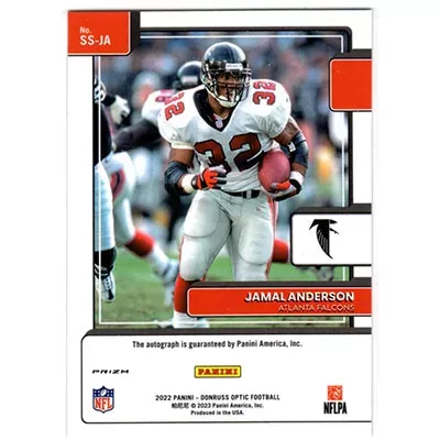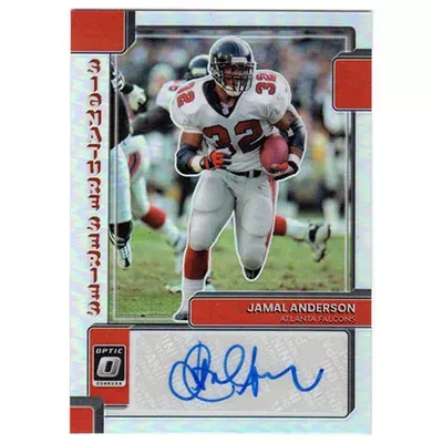 This is a 2022 Donruss Optic Signature Series Holo Jamal Anderson autographed football card. This card features an autographs of Jamal Anderson, signed in blue, and certified authentic by Panini. The card is #SS-JA and is in NM-MT condition.
