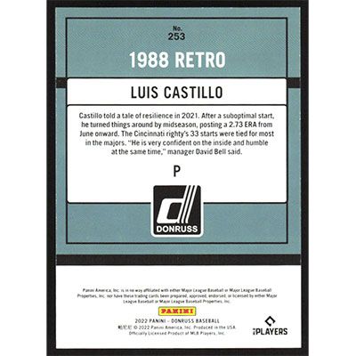 This is a 2022 Donruss Red Luis Castillo baseball card. The card is #253 and pictures show condition. This card is limited; #'d 0095/2022. Team(s): Cincinnati Reds