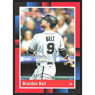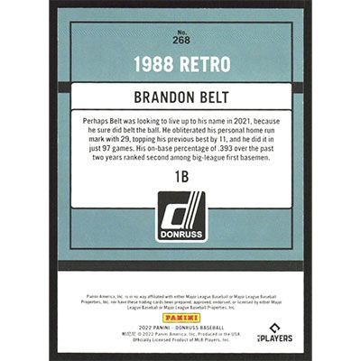 This is a 2022 Donruss Red Brandon Belt Retro 1988 baseball card. The card is #268 and pictures show condition. This card is limited; #'d /2022. Team(s): San Francisco Giants