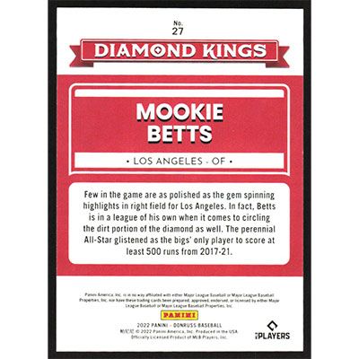 This is a 2022 Donruss Red Mookie Betts Diamond Kings baseball card. The card is #27 and pictures show condition. This card is limited; #'d 0639/2022. Team(s): Los Angeles Dodgers