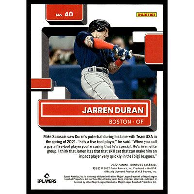 This is a 2022 Donruss Red Jarren Duran Rated Rookie baseball card. The card is #40 and pictures show condition. This card is limited; #'d 1906/2022. Team(s): Boston Red Sox Rookie Card (RC)