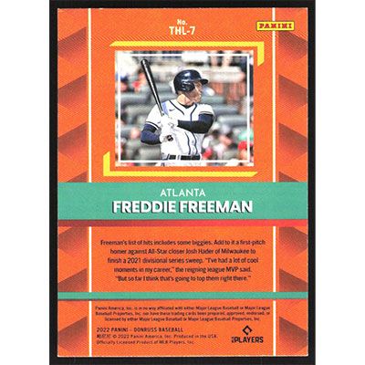 This is a 2022 Donruss The Hit List Rapture Freddie Freeman baseball card. The card is #THL-7 and pictures show condition.