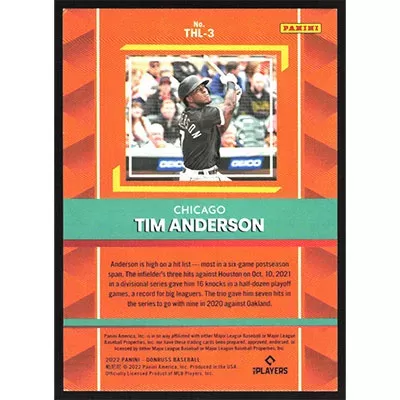 This is a 2022 Donruss The Hit List Tim Anderson baseball card. The card is #THL-3 and pictures show condition. This card is limited; #'d 288/999. Team(s): Chicago White Sox