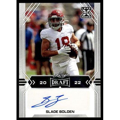 This is a 2022 Leaf Draft Autographs Slade Bolden football card. This card features an autograph of Slade Bolden, signed in blue, and is certified authentic by Leaf. The card is #BA-SB1 and pictures show condition.