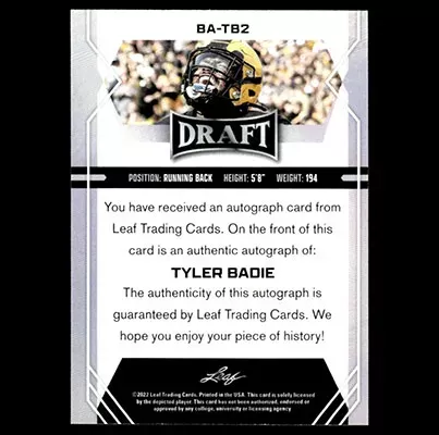 This is a 2022 Leaf Draft Autographs Tyler Badie football card. This card features an authentic autograph of Tyler Badie, and is certified authentic by Leaf. The card is #BA-TB2 and is in NM-MT condition.