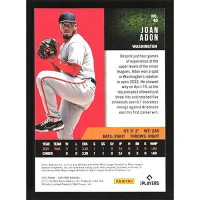 This is a 2022 Panini Capstone Joan Adon baseball card. The card is #46 and pictures show condition. Team(s): Washington Nationals Rookie Card (RC)
