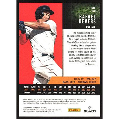 This is a 2022 Panini Capstone Rafael Devers baseball card. The card is #60 and pictures show condition.