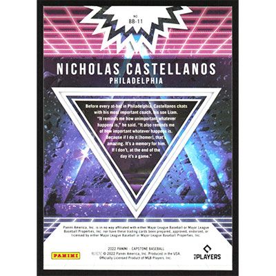 This is a 2022 Panini Capstone Big Bang Nicholas Castellanos baseball card. The card is #BB-11 and pictures show condition. Team(s): Philadelphia Phillies