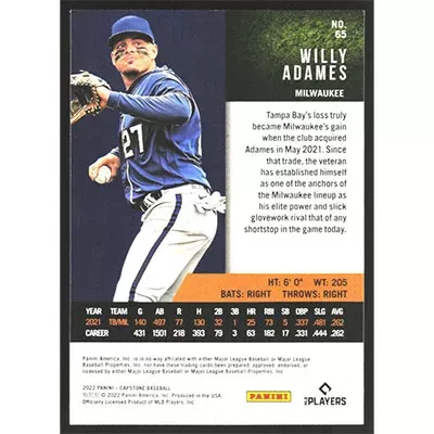 This is a 2022 Panini Capstone Blue Willy Adames baseball card. The card is #65 and pictures show condition.