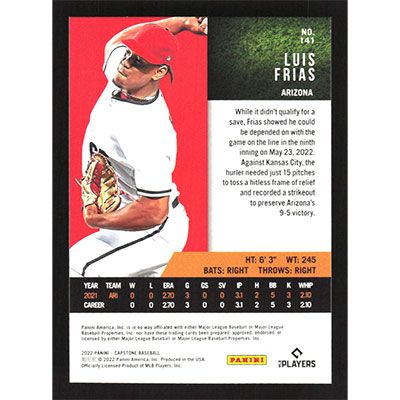 This is a 2022 Panini Capstone Gold Luis Frias baseball card. The card is #141 and pictures show condition. Team(s): Arizona Diamondbacks Rookie Card (RC)
