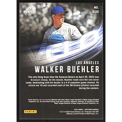 This is a 2022 Panini Capstone Velo Walker Buehler baseball card. The card is #V-20 and pictures show condition.