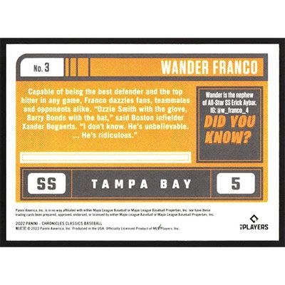 This is a 2022 Panini Chronicles Classics Wander Franco baseball card. The card is #3 and pictures show condition. Team(s): Tampa Bay Rays Rookie Card (RC)