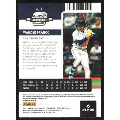 This is a 2022 Panini Chronicles Contenders Optic Building Blocks Wander Franco baseball card. The card is #1 and pictures show condition. Team(s): Tampa Bay Rays Rookie Card (RC)