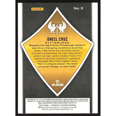 This is a 2022 Panini Chronicles Crusade Oneil Cruz baseball card. The card is #3 and pictures show condition. Team(s): Pittsburgh Pirates Rookie Card (RC)
