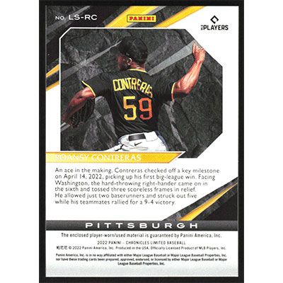 This is a 2022 Panini Chronicles Limited Swatches Roansy Contreras Jersey baseball card. The card is #LS-RC and pictures show condition. Team(s): Pittsburgh Pirates