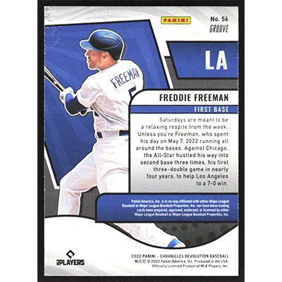 This is a 2022 Panini Chronicles Revolution Groove Freddie Freeman baseball card. The card is #56 and pictures show condition. Team(s): Los Angeles Dodgers