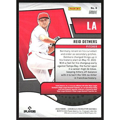 This is a 2022 Panini Chronicles Revolution Groove Reid Detmers baseball card. The card is #8 and pictures show condition. Team(s): Los Angeles Angels Rookie Card (RC)