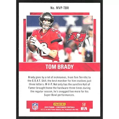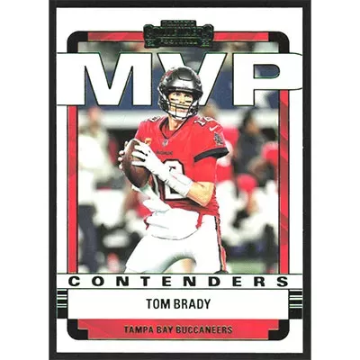 This is a 2022 Panini Contenders MVP Contenders Emerald Tom Brady football card. The card is #MVP-TBR and pictures show condition. Team: Tampa Bay Buccaneers