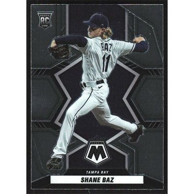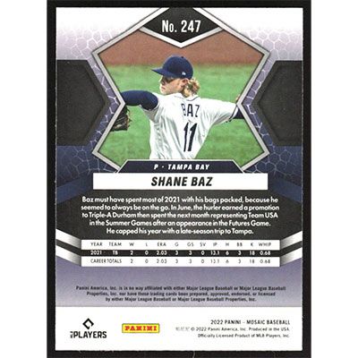 This is a 2022 Panini Mosaic Shane Baz baseball card. The card is #247 and pictures show condition.