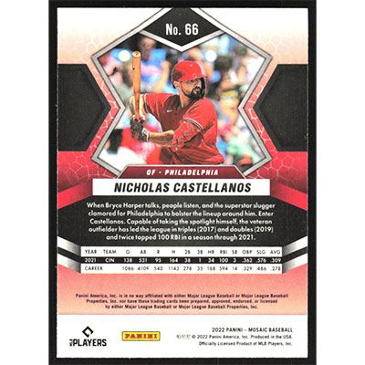 This is a 2022 Panini Mosaic Nicholas Castellanos baseball card. The card is #66 and pictures show condition.
