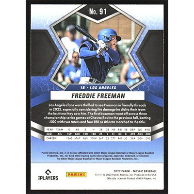 This is a 2022 Panini Mosaic Freddie Freeman baseball card. The card is #91 and pictures show condition.