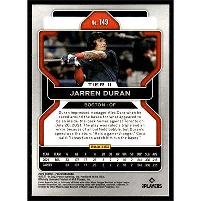 This is a 2022 Panini Prizm Jarren Duran baseball card. The card is #149 and pictures show condition.